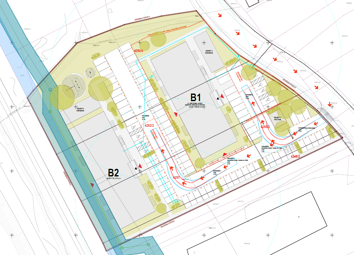 Parkiranje bo omogočeno na zunanjih parkiriščih ob dostopni cesti, kjer bodo predvidena tudi parkirišča za obiskovalce. V soseski bo med objekti v sklopu zunanjih bivalnih površin postavljeno otroško igrišče in skupne zunanje površine za druženje. Zunanja ureditev bo zasnovana tako, da bo zmanjšala vpliv hrupa prometnih cest in omogočila kvalitetne zunanje ambiente za stanovalce in uporabnike sosednjega vrtca.